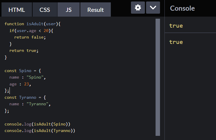 객체의 나이를 확인해서 20보다 작을 경우 -> false 를 반환하는 함수
