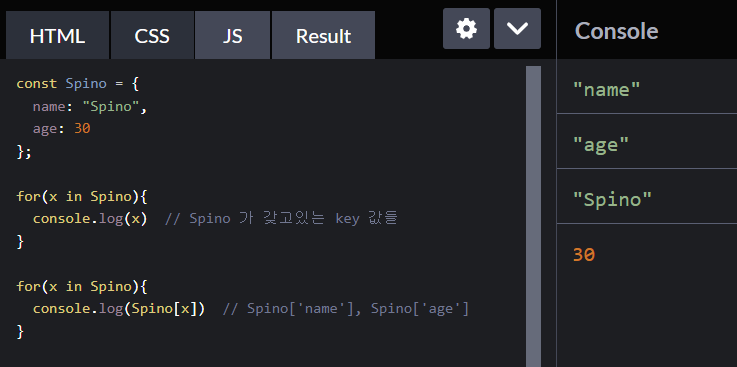 in 말고 of 로 기억하자 (파이썬에서 for ... in 이랑 비슷한거같다)