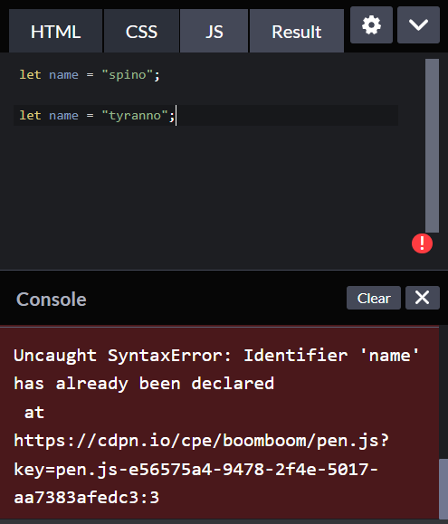같은 변수 이름을 재 선언하면 구문오류 뜸.