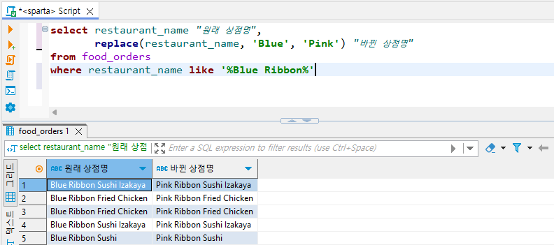 SQL문 기본 구조select : 데이터 조회from : 어떤 테이블에서 가져올지where : 조건 주기group by : 범주 지정order by : 쿼리 결과를 정리순서 replace블루라고 적힌 부분을 핑크로 바꿔줘 라는 뜻 replace(바꿀 컬럼, 현재 값, 바꿀 값) substr : 특정한 문자만 뽑아주는 구문1번째 글자부터 두글자씩 뽑아와달라는 의미. 결과 : 서울 concat : 붙여줘라는 뜻.join 함수처럼 문자열을 합할 수 있다. 지금 컬럼이 세 가지가 있는데 (select)group by 로 묶을 때 명시적으로 하기 위해서는 컬럼명을 다 적어도 되고첫번째 컬럼, 두 번째 컬럼을 묶어준다는 의미로 1, 2 라고 써도 똑같음. 끝에 숫자 안적으면 마지막까지임. if (조건..
